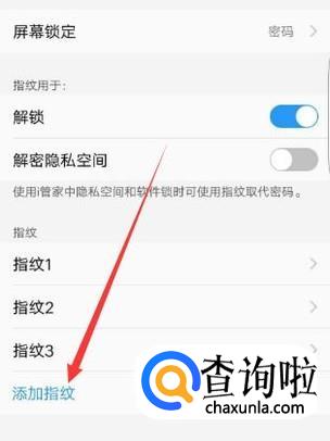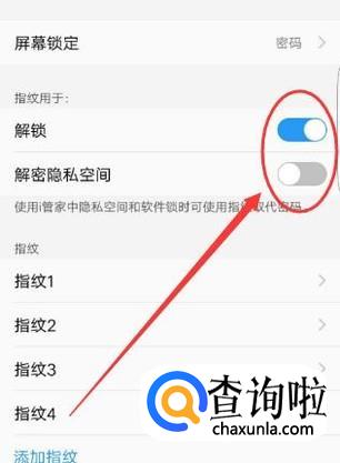 录入成功之后,可以设置指纹用于解锁和解密隐私空间,如图所示。