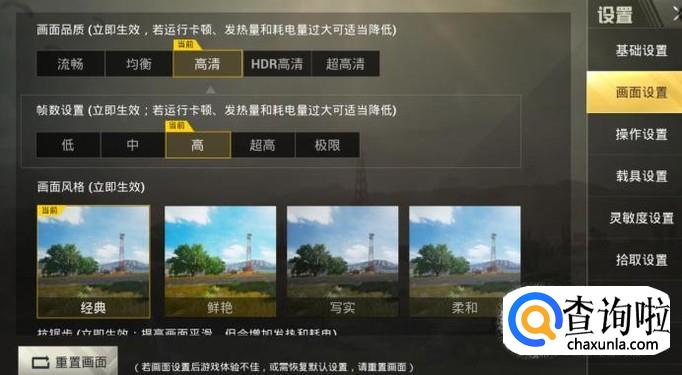 然后是画面设置,画面品质和游戏帧数根据您的手机来选择,好一点的手机可以选择超高或以上,风格选择鲜艳更容易发现敌人