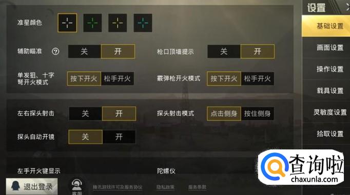 基础设置,可以选择您喜欢的准星颜色,按下开火或者松手开火,探头自动开镜等