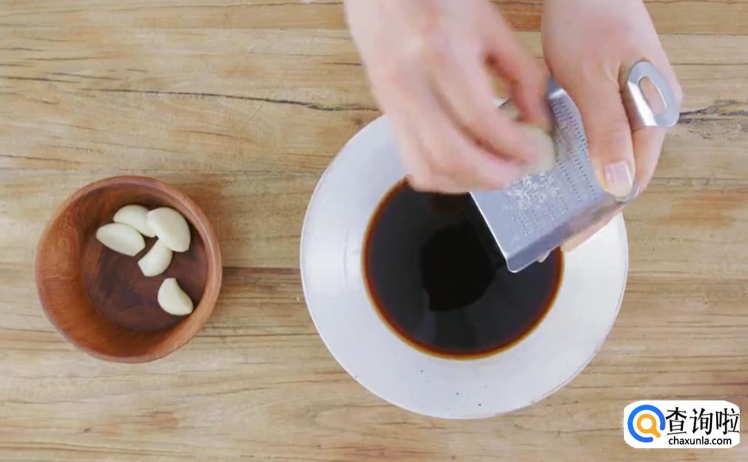 将味醂倒入锅中,煮热至沸腾,然后加入酱油、蜂蜜搅拌均匀,煮沸后关火,倒入碗中,加入捣碎的大蒜泥,搅拌均匀。