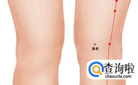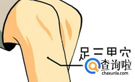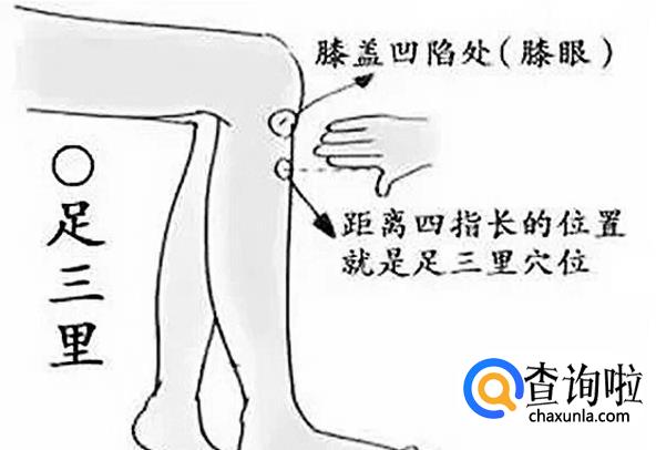 第二种寻找方法:外膝眼下三寸,胫骨外侧约一横指处。左腿为例,坐椅上,用右手掌按膝盖骨正中央,轻抓膝盖。中指沿胫骨伸长,在中指尖水平画线,与食指方向延长线交汇处就是它的位置。