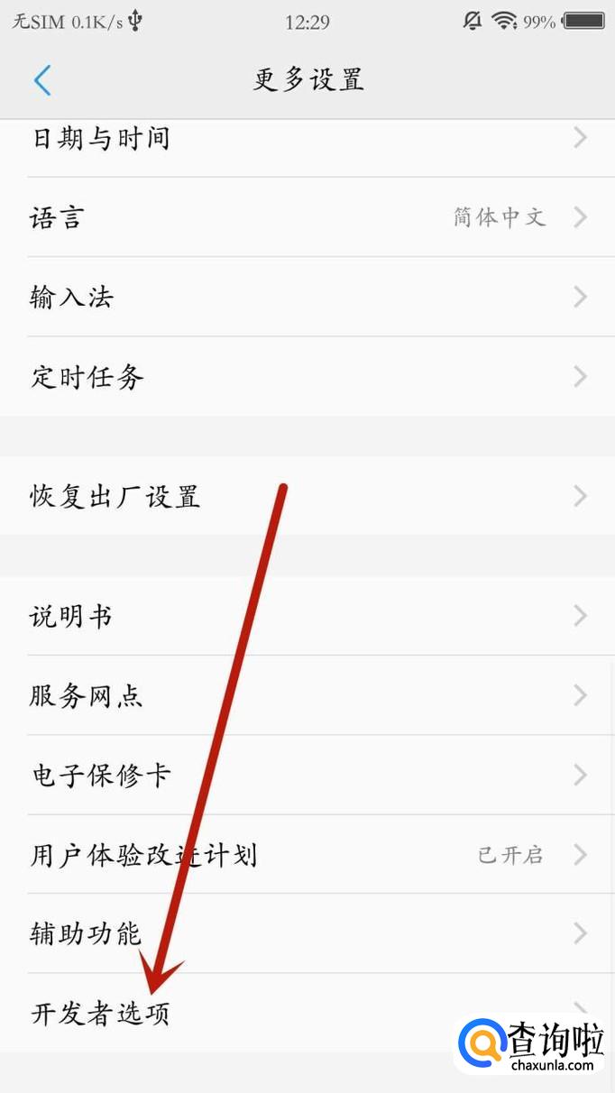 返回“更多设置”页面最底端,点击“开发者选项”,如图所示。