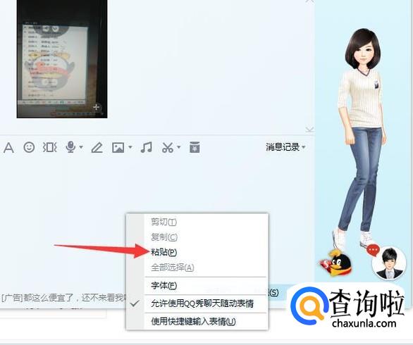 这样就已经截图完成了,随便打开一个聊天窗口按下键盘Ctrl+V就可以直接粘贴下来,或者鼠标右键点击聊天窗口,在出现的页面选择粘贴就可以。