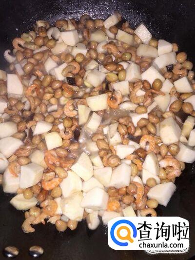 开火,加入适量的食用油,待油温升高后,将香菇入锅炒香,再下花生、芋头、虾米,入锅炒香;