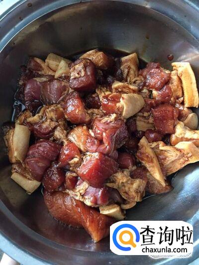 将五花肉放入盆里,加入适量的蚝油、生抽、老抽、料酒,抓匀,腌制半小时以上,才能入味;