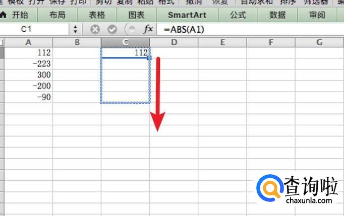 使用下拉填充功能,把函数应用到下方的单元格里。这样就可以计算出对应的A列的数据的绝对值了。