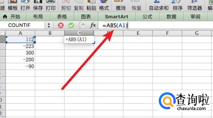 要计算绝对值,我们可以使用ABS函数,参数输入A1,表示我们要计算A1单元格的绝对值。