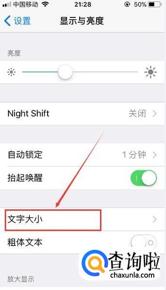 进入到“显示与亮度”页面,用户会看到有一个叫做“文字大小”的功能按键,然后点击“文字大小”功能按键。