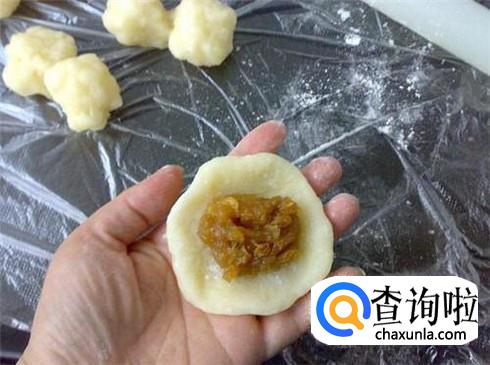 把面团摊开,再把月饼馅料放入中间,捏紧。