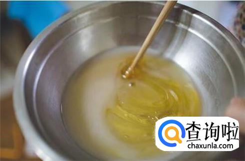 取适量的糖浆,倒入碗中,加入适量的食用碱水和色拉油,搅拌均匀。