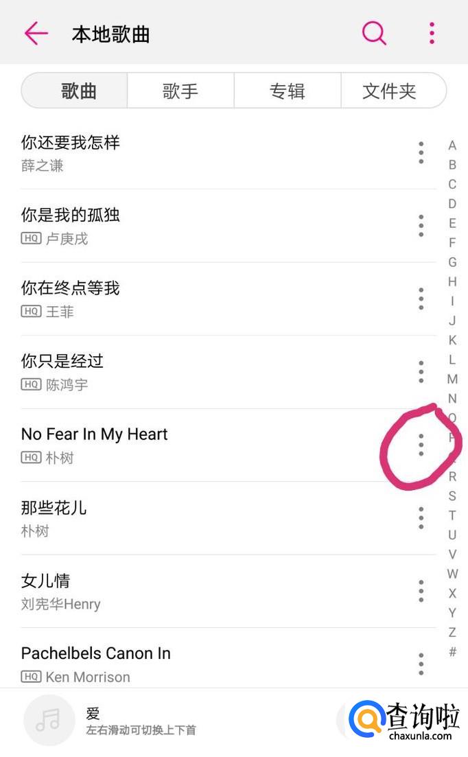 进入你的歌单列表,选择一首你想设为铃声的歌曲,点击右边红圈处的小点。
