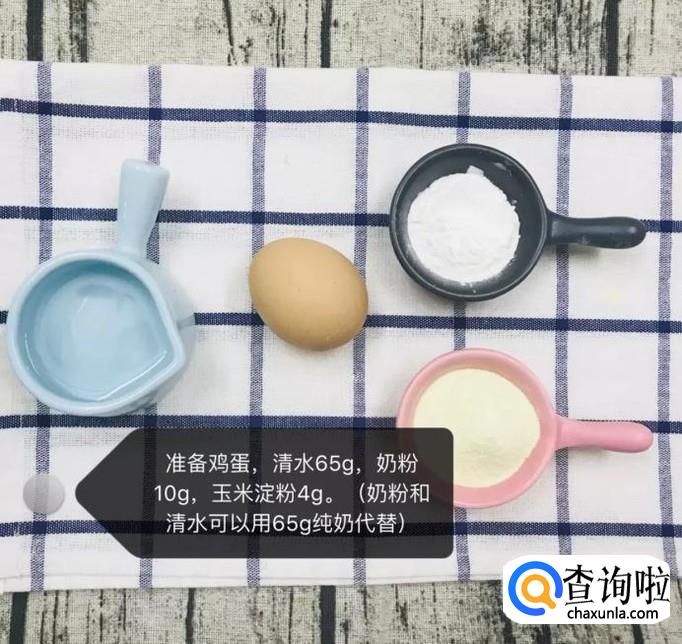 首先准备好要用到的鸡蛋一个、清水65克、奶粉十克、玉米淀粉4克。小贴士:奶粉和清水可以用65克的纯牛奶代替。