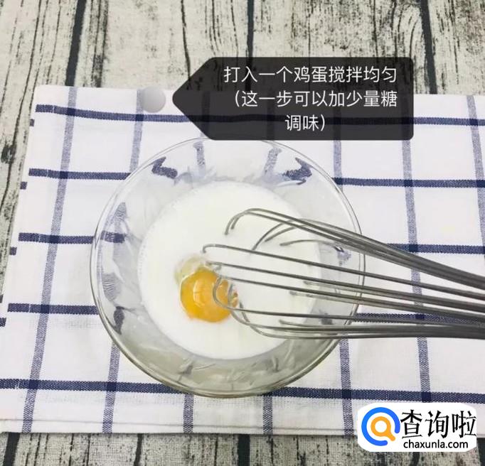 然后在一个碗中打入一个鸡蛋,加入奶粉和清水,如下图所示。
