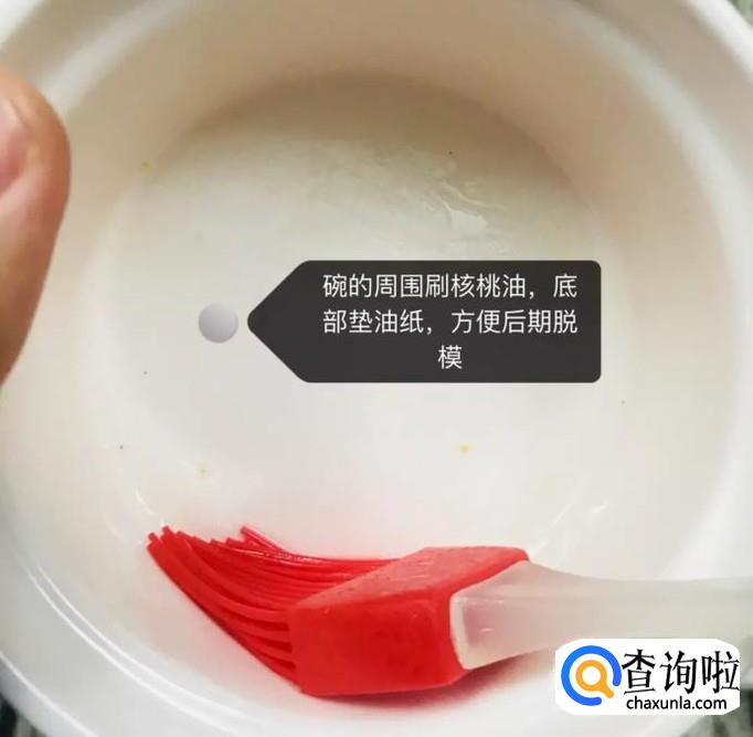 然后在一个碗中刷上核桃油,底部垫上油纸。如下图所示。小贴士:这样做方便后期脱模,这一点大家一定要注意哦!