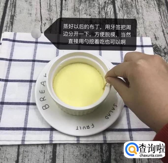 接着用牙签把蒸好的布丁周边分开,这样做方便脱模,如下图所示。