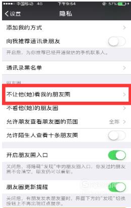 这时候我们来到隐私设置界面,从界面上可以找到朋友圈,在朋友圈的下方点击不让他(她)看到我的朋友圈