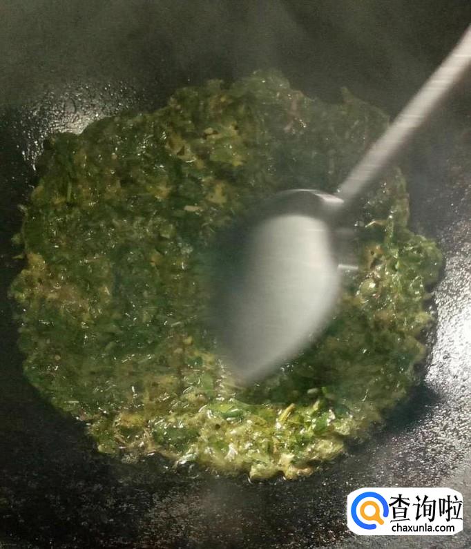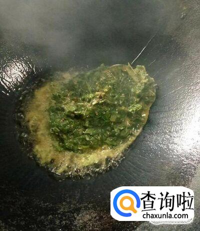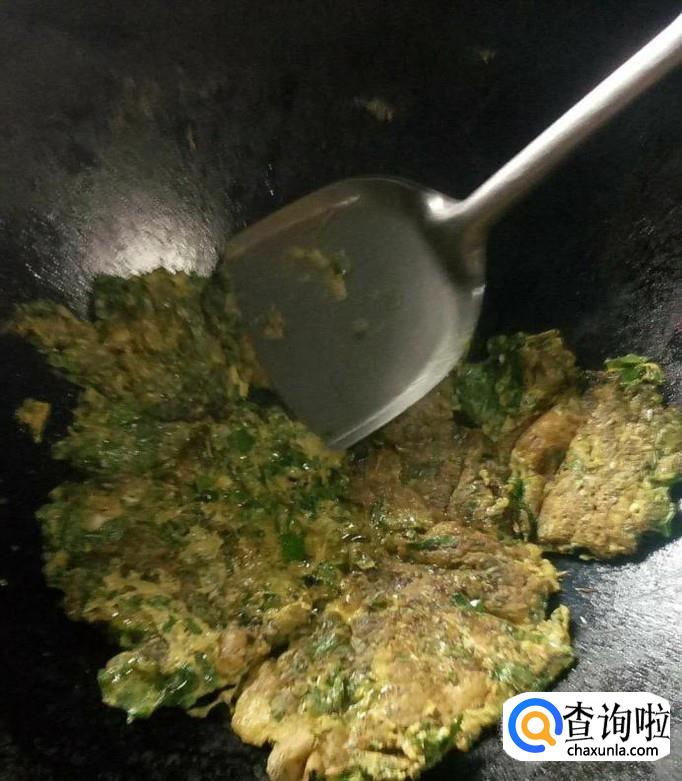 然后我们向其中加入搅拌好的蒲公英鸡蛋液,如下图所示