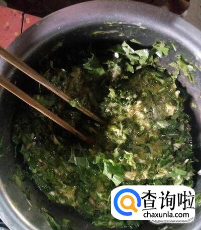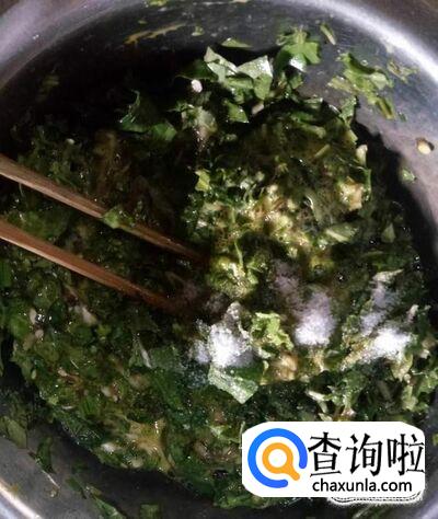 再加入适量盐,搅拌均匀,最好是在蒲公英与鸡蛋搅拌均匀后再加盐搅拌。