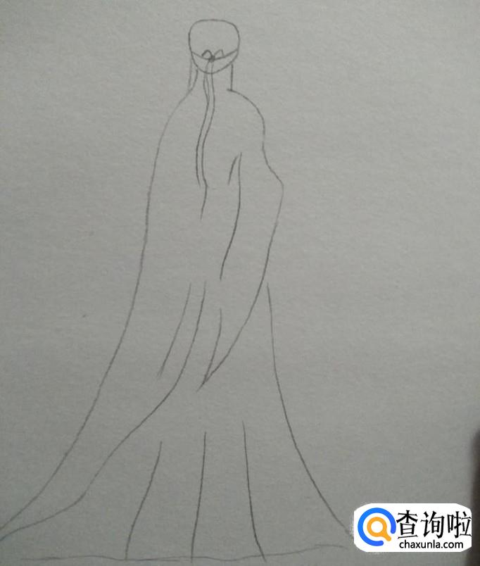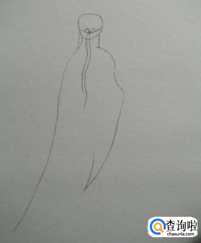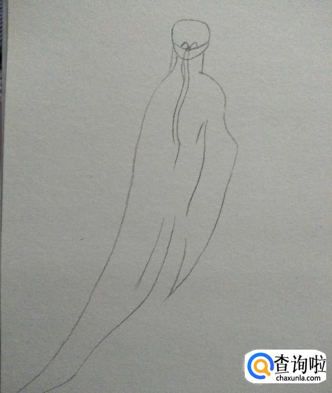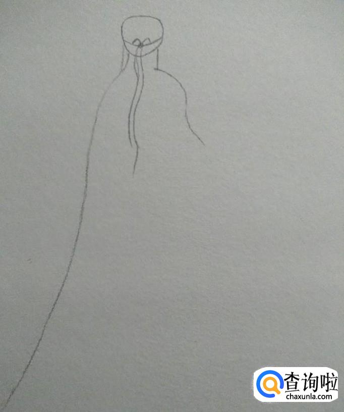 如下图一所示,画出肩膀部分与左侧的衣摆,然后用一根曲线画出右边的衣袖