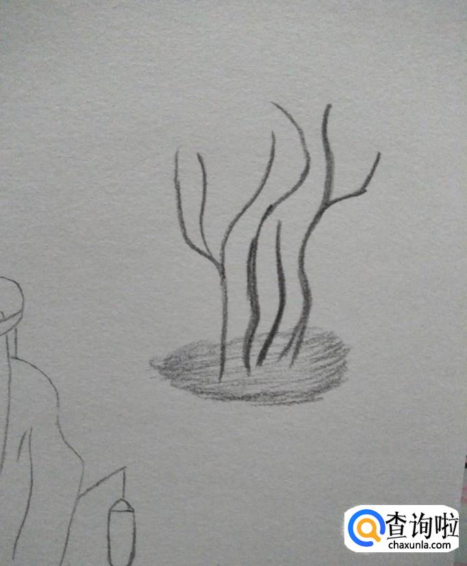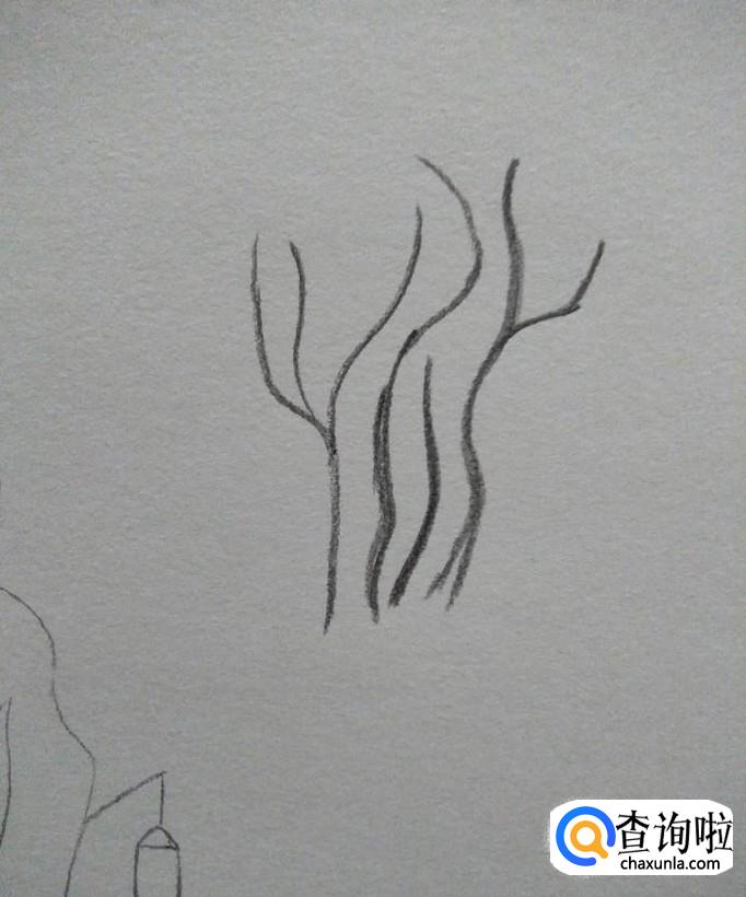 接下来,用黑色的彩铅笔在素描本的右上方画出一些树木的枝干,然后以画圈的方式勾勒出地面