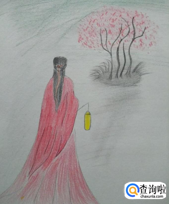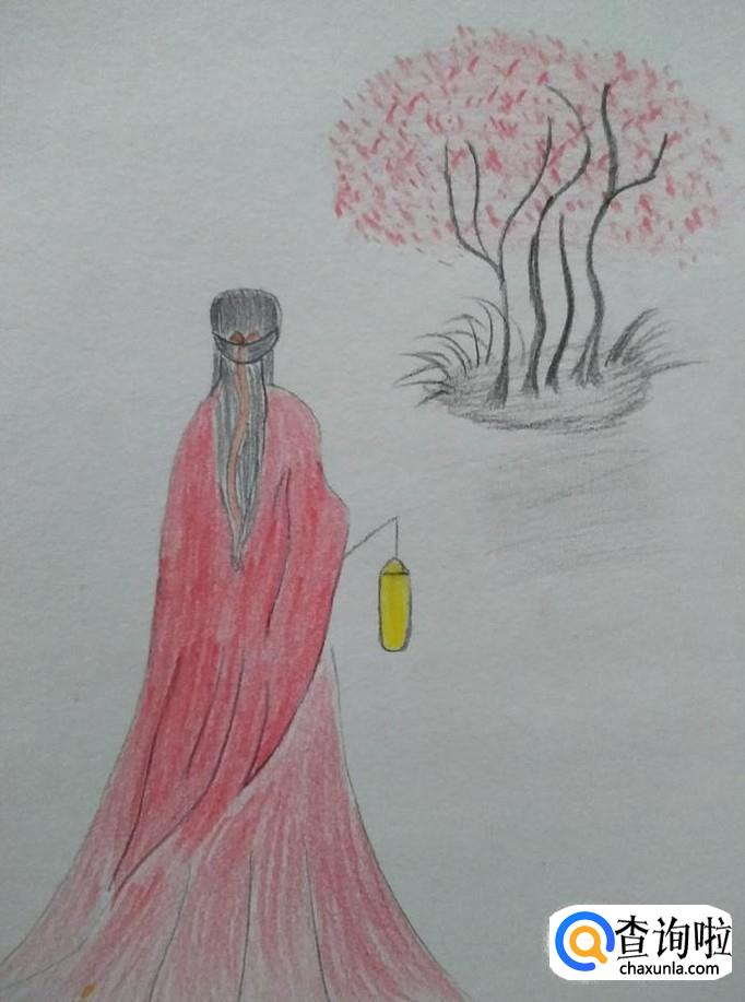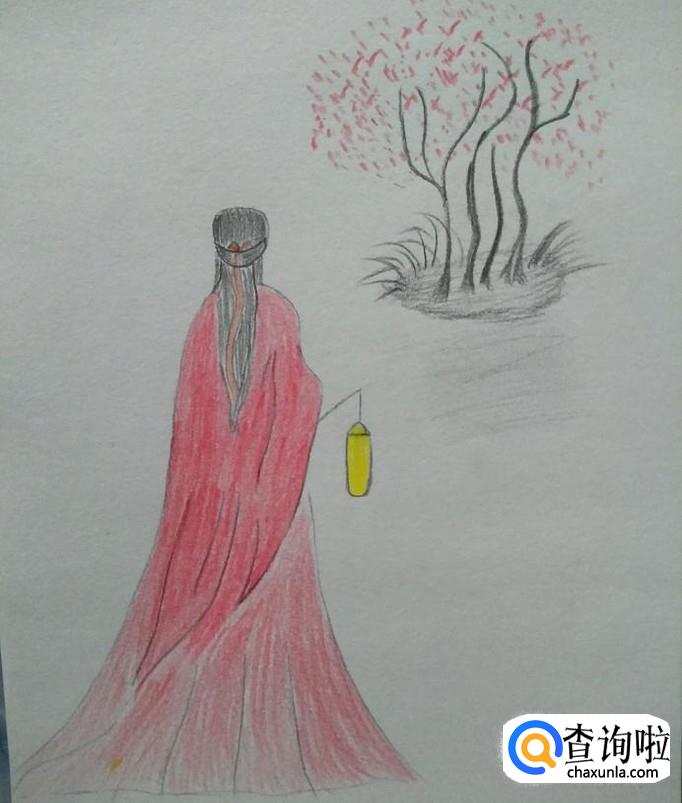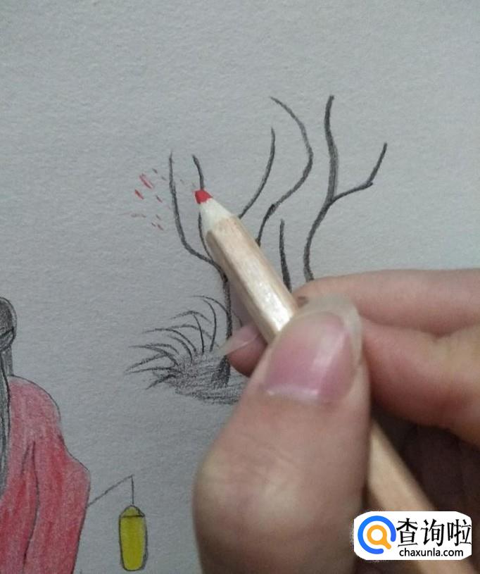 树上用红色彩铅点一些点,灯笼涂成黄色,如下图所示