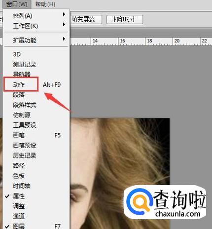 打开图片之后我们在菜单那里找到窗口选项,点击该选项在其内找到动作选项,如图所示: