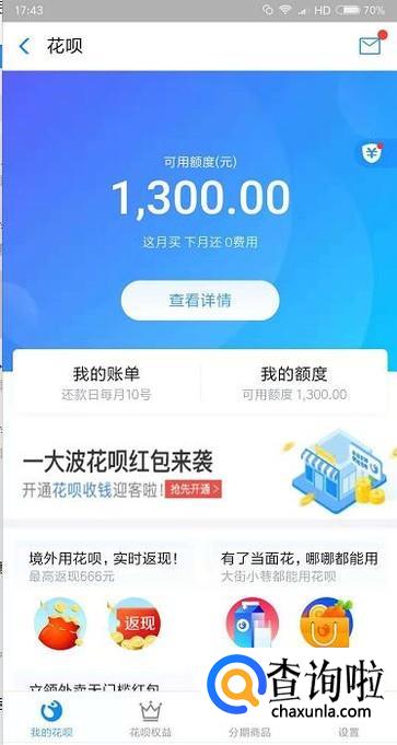 首先我们登录支付宝账号后在我的页面里进入到花呗的功能。