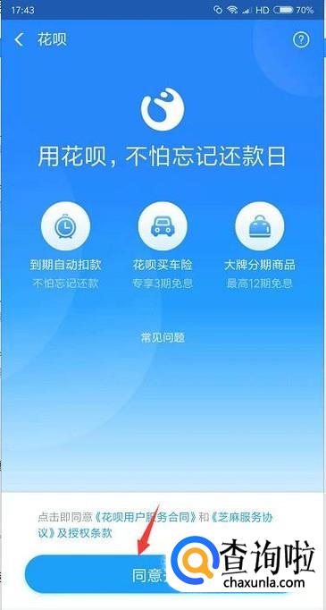 点击花呗功能后系统会提示我们开通,点击下方的同意即可。