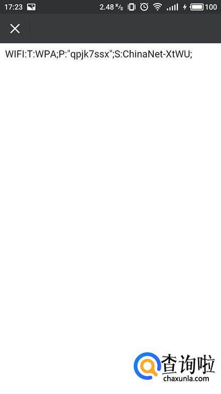 点击保存的二维码图片,等待系统扫描后,即会出现密码,其中“”中的字符即为WIFI密码。