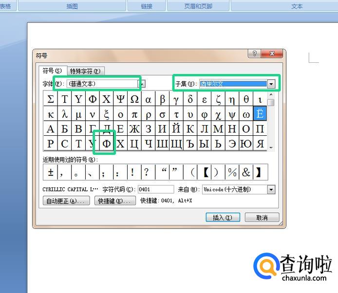 选择符号字体为普通文本,子集为西里尔文,在符号列表中找到φ。