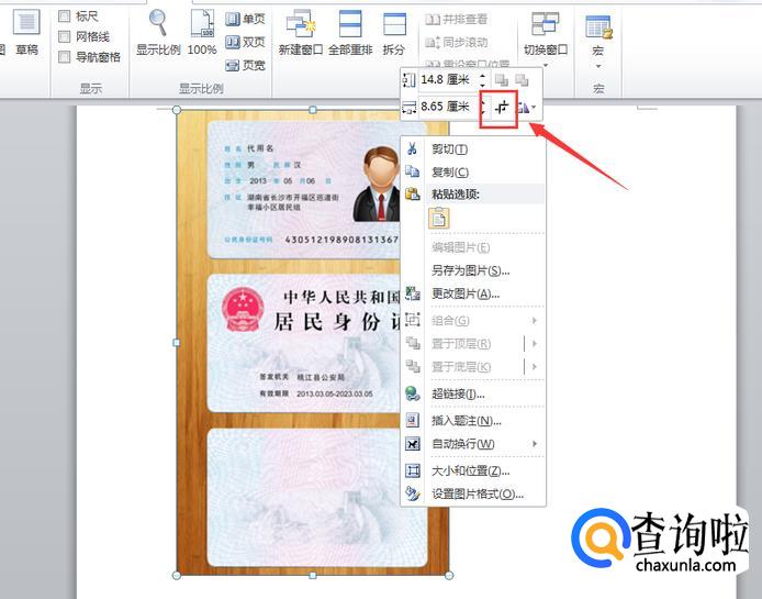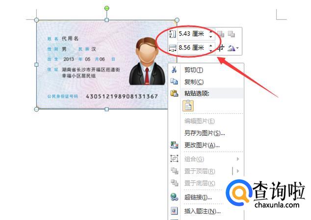 在照片上右击鼠标,找到更改图片宽和高的文本框,将高设置成8.56cm,宽设置成5.43cm。如图: