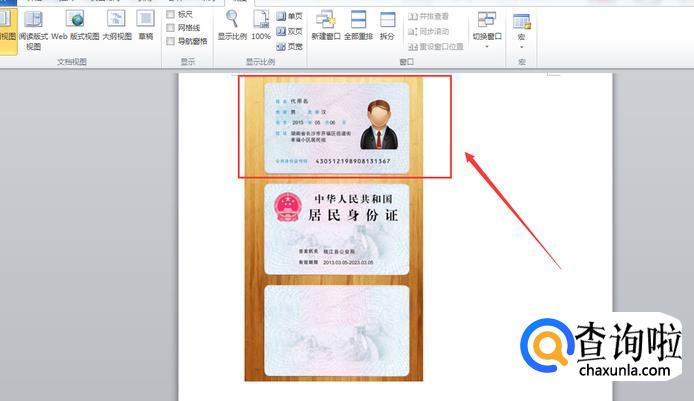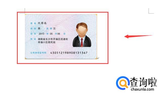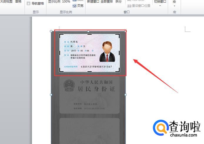 把手机拍摄的身份证照片拖入Word,图中红色方框内的正是我们需要打印的部分;
