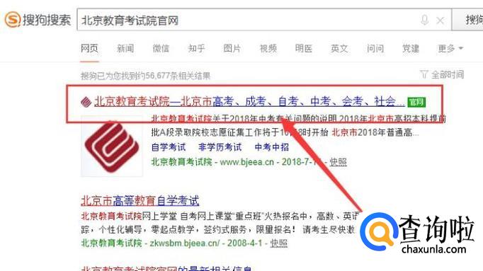 打开搜狗搜索,搜索“北京教育考试院官网”,点击官网链接并进入,如图所示。