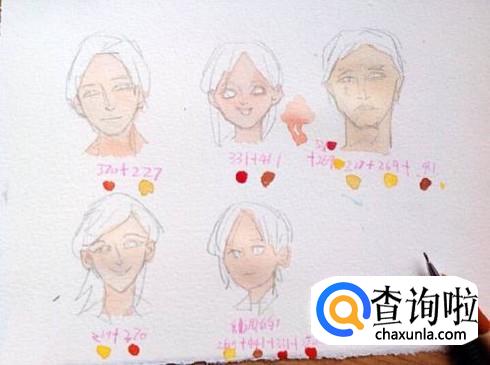 用浅黄色的水彩加上明黄色的水彩当做底色,调匀之后再加一点儿玫红色,就能够调出来肤色,深浅的话可以加水来进行控制。