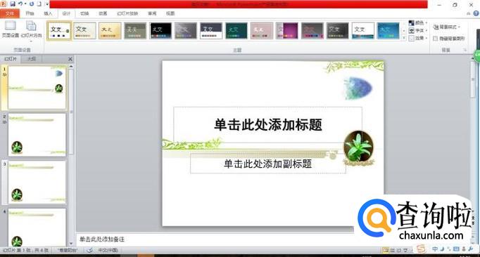 再点击选项栏的“设计”,会出现30多个不同的模板,选择一个契合主题切美观的模板,点击并应用,一个简单漂亮的PPT演示课件就制作好了,如图