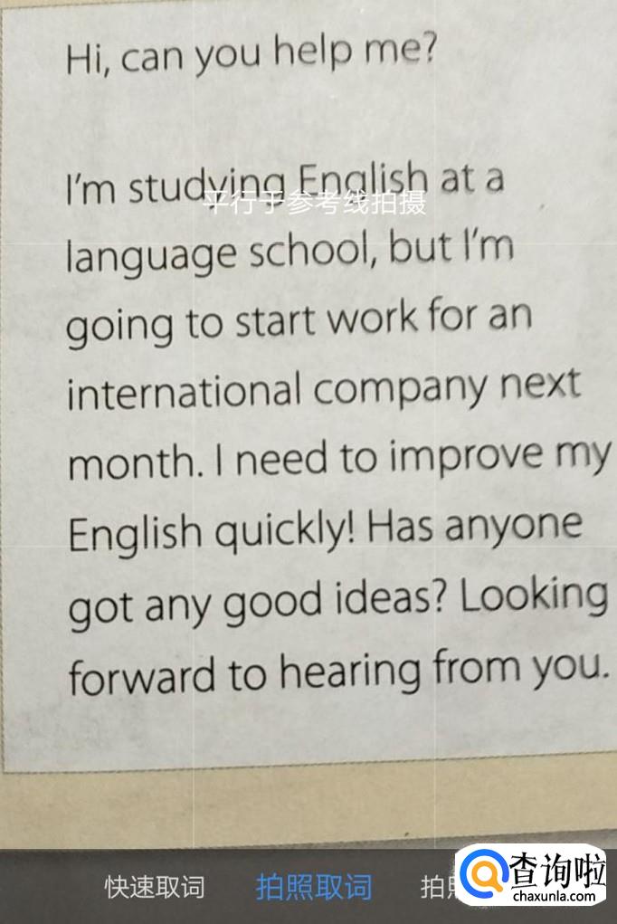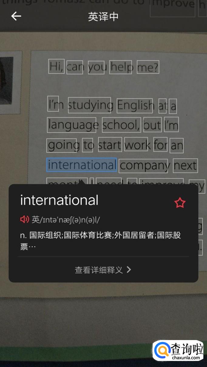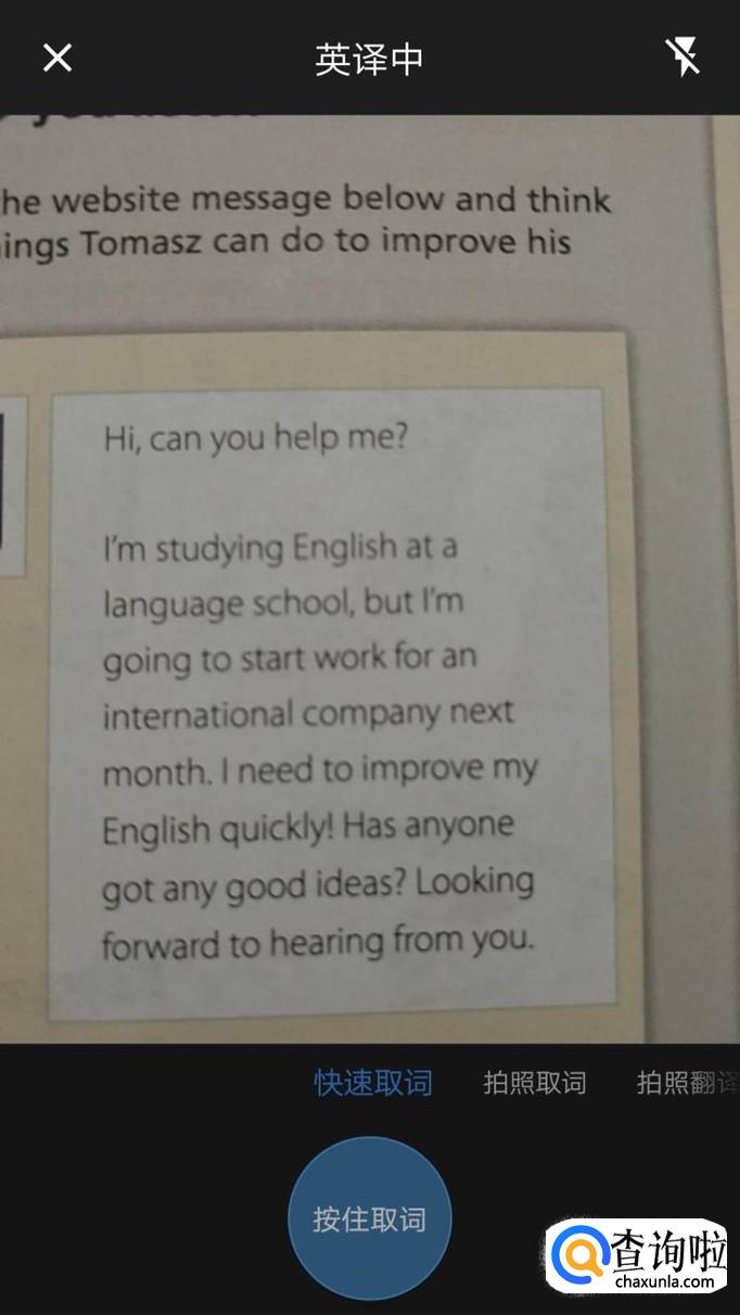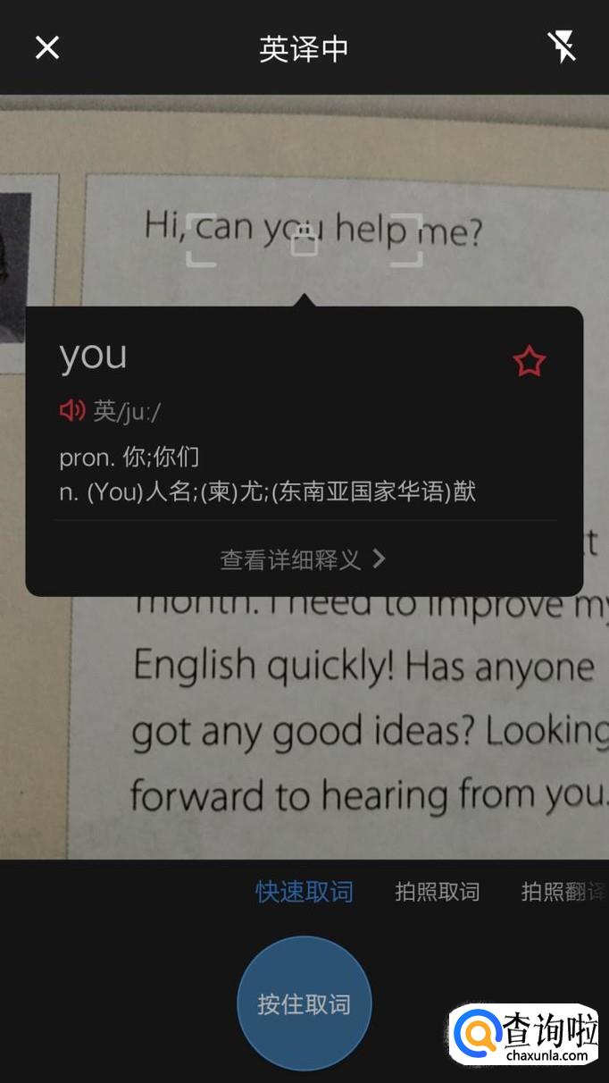 我们有两种取词方式,首先介绍拍照取词,选择拍照取词,按照提示把取词内容放入指定区域,然后就会看到每个词被框框住,任意点击每个框就可以看到如图所示的效果。