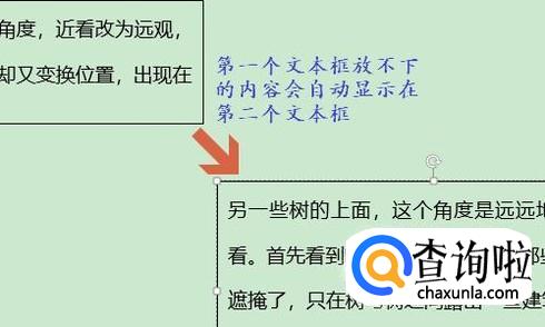 此时鼠标会变成一个杯子形状,我们将其移动到第二个文本框上面,然后点击一下,第一个文本框放不下的内容就会出现在第二个文本框了,如图所示...