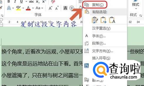 如果我们想将这段文字显示在页面的其他地方,很多人可能会使用复制粘贴的方式,不过粘贴以后的格式还和原来一样,如果粘贴到的位置太小,就需要不断的调整段落才能放下,这种情况下就要用到文本框了,首先我们依旧是将这段文字内容复制下来;