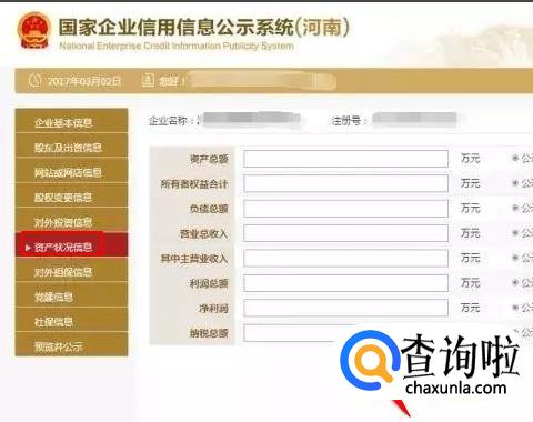 点击左边“资产状况信息”填写后保存。企业资产状况信息,应当是企业年度资产负债表和损益表(利润表)中的期末数;纳税总额为企业全年实缴各类税金的总和。