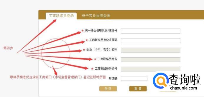 点击自己企业所在省份后会立即进入如下工商联络员登录界面,填入企业在注册时所留联络信息后点登录。