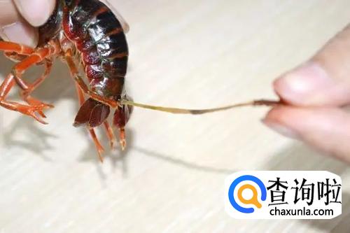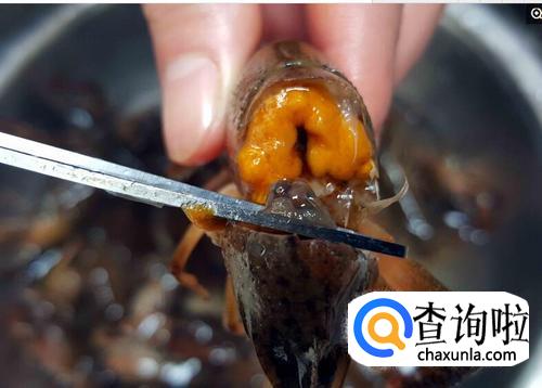 剪开头部以后,用剪刀尖挖出头部里面黑色囊状物体——虾胃,可以从背后捏住龙虾背中间部位,用剪子尖把里面的胃囊挑出来。