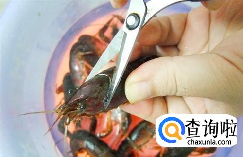 剪虾时,鲜活的小龙虾威力挺大,为避免虾钳夹手,我们先将其“敲晕”,用手捏住小龙虾头部,先剪去小龙虾的右钳,再剪去左钳,将剪下的虾钳洗净备用,这可以食用的,不要丢掉。