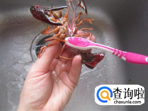 这个时候再用刷子刷洗干净。大家都知道,龙虾最难清洗的就是其腹部和爪子部分,要用刷子仔仔细细刷洗干净。另外家里不用的钢丝球也可以用来洗刷腹部泥土,刷洗时一只手要抓住龙虾的背部,防止手被钳住。