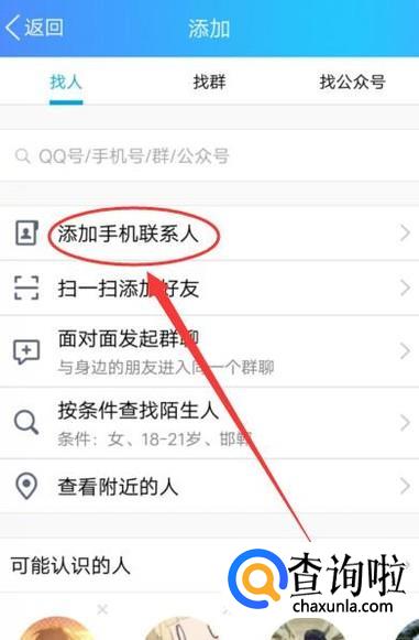 进入之后,点击右上角的“+”,然后选择“添加手机联系人”,如图所示。