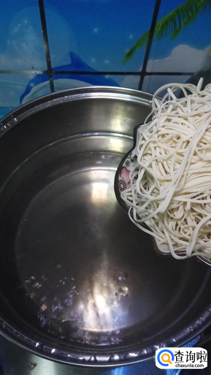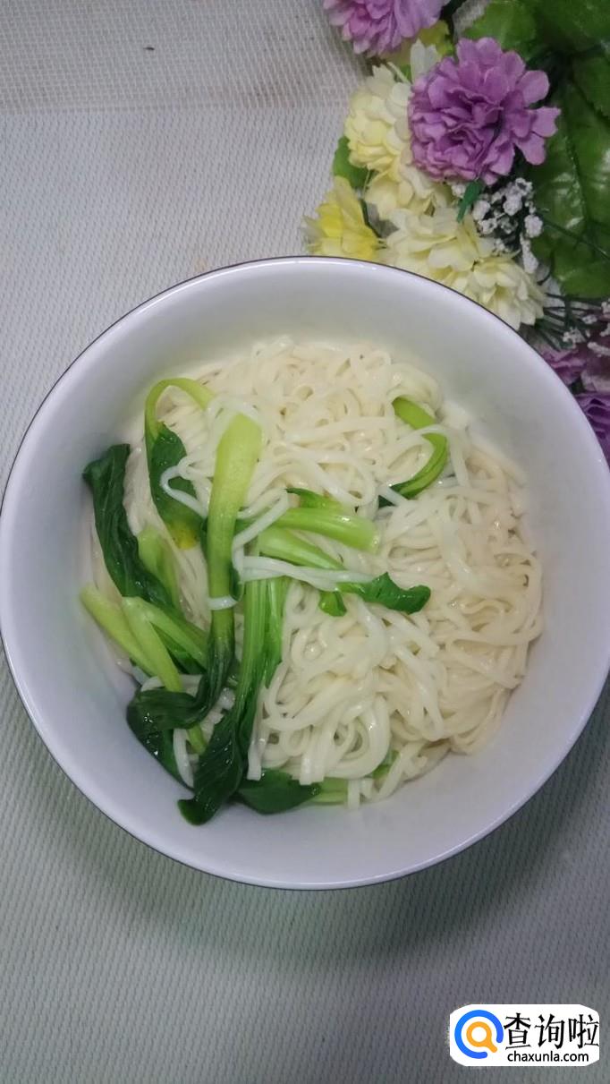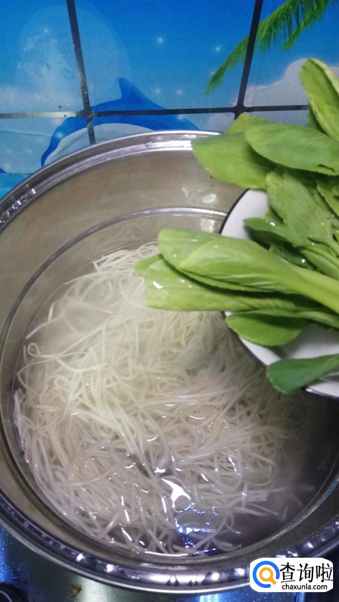 锅中烧开水,下入适量面条,煮熟后,放入适量青菜,面条里就有了青菜的清香。面条煮熟后,捞出,放入碗中备用。