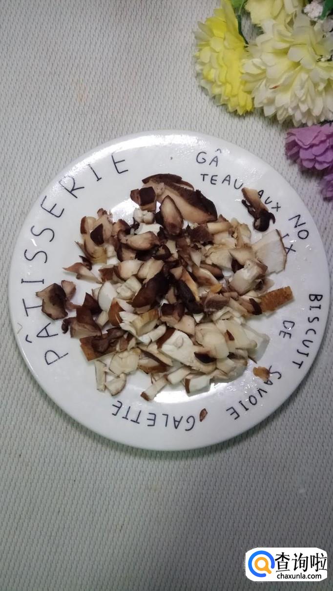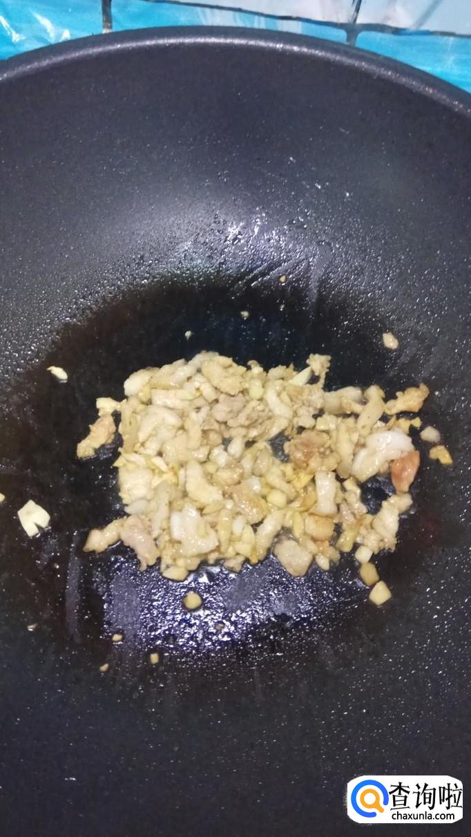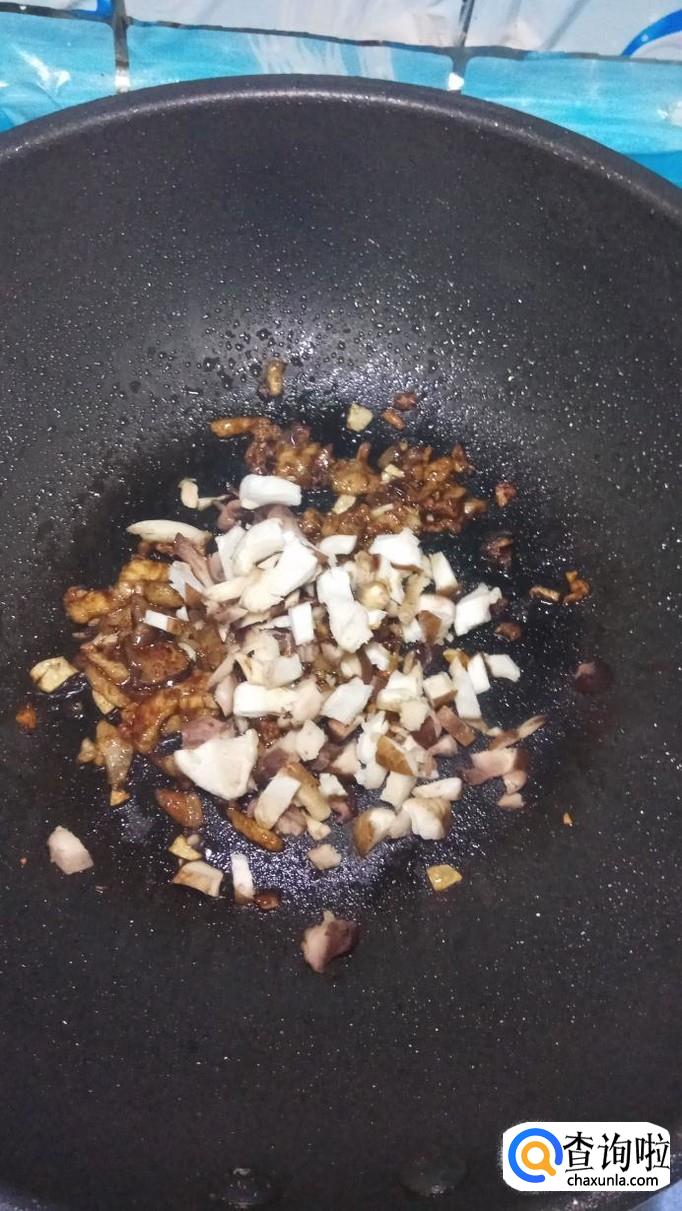 将切好的香菇块放入锅中,和五花肉一起翻炒,炒至变软就差不多了。