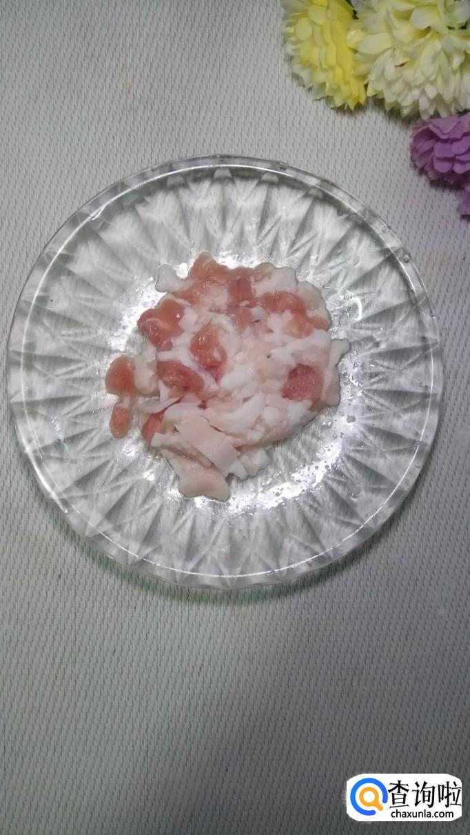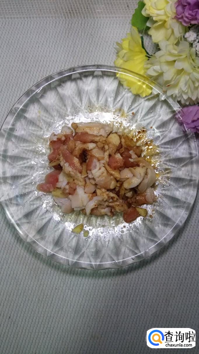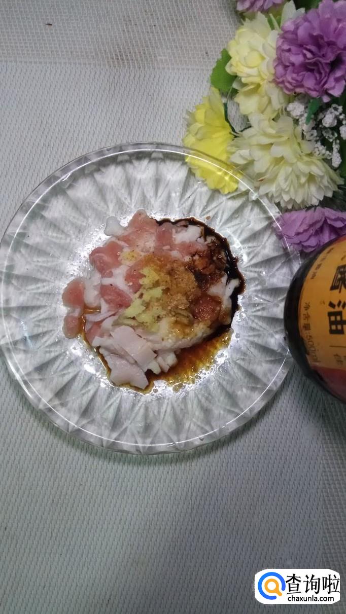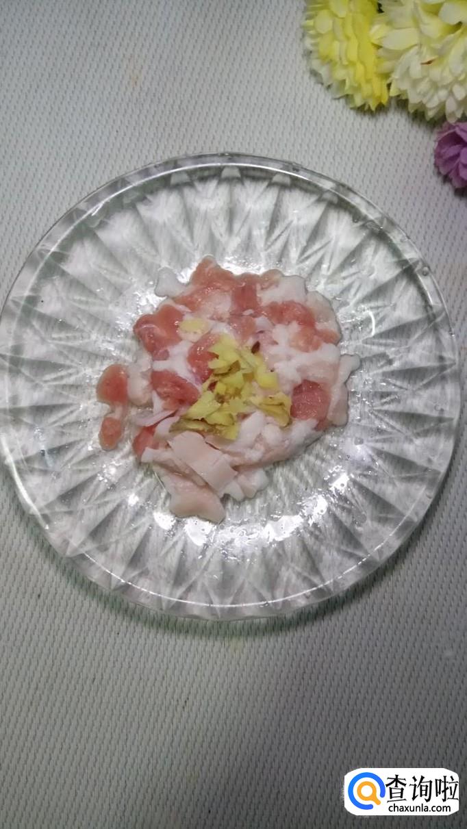 取适量生姜,切碎后放在五花肉上面,再加入适量盐,鸡精,五香粉,生抽,老抽,料酒,搅拌均匀,腌制15分钟。