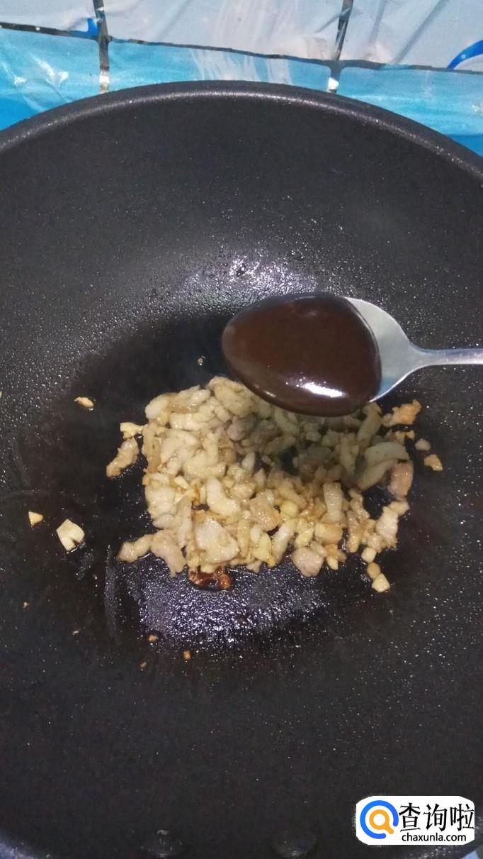 锅中烧热油,油热后将五花肉倒入锅中炒香,加入一勺甜面酱,炸出香味。