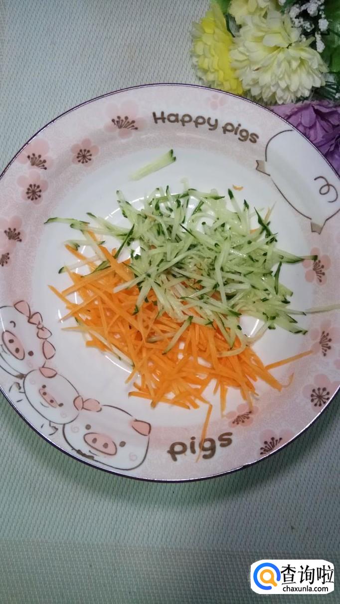 将炸好的酱浇在面条上面,取适量黄瓜和胡萝卜,擦成细丝,放在面条上面,搅拌均匀就可以吃了,美味营养,特别好吃。