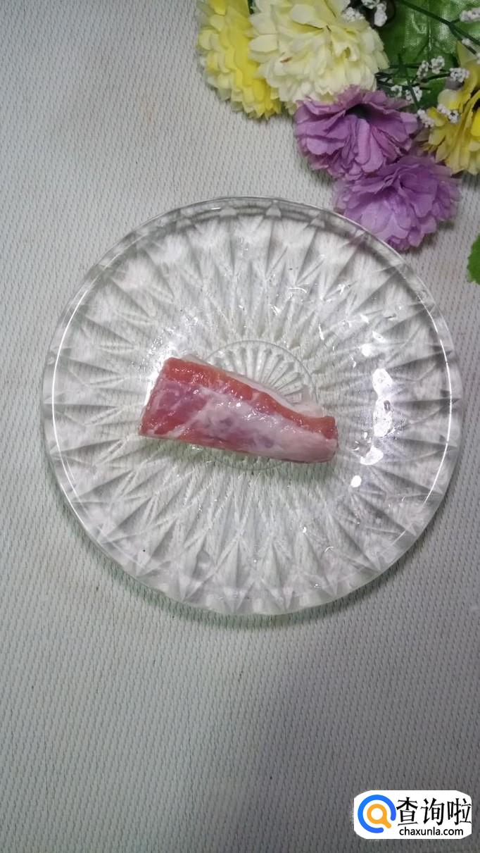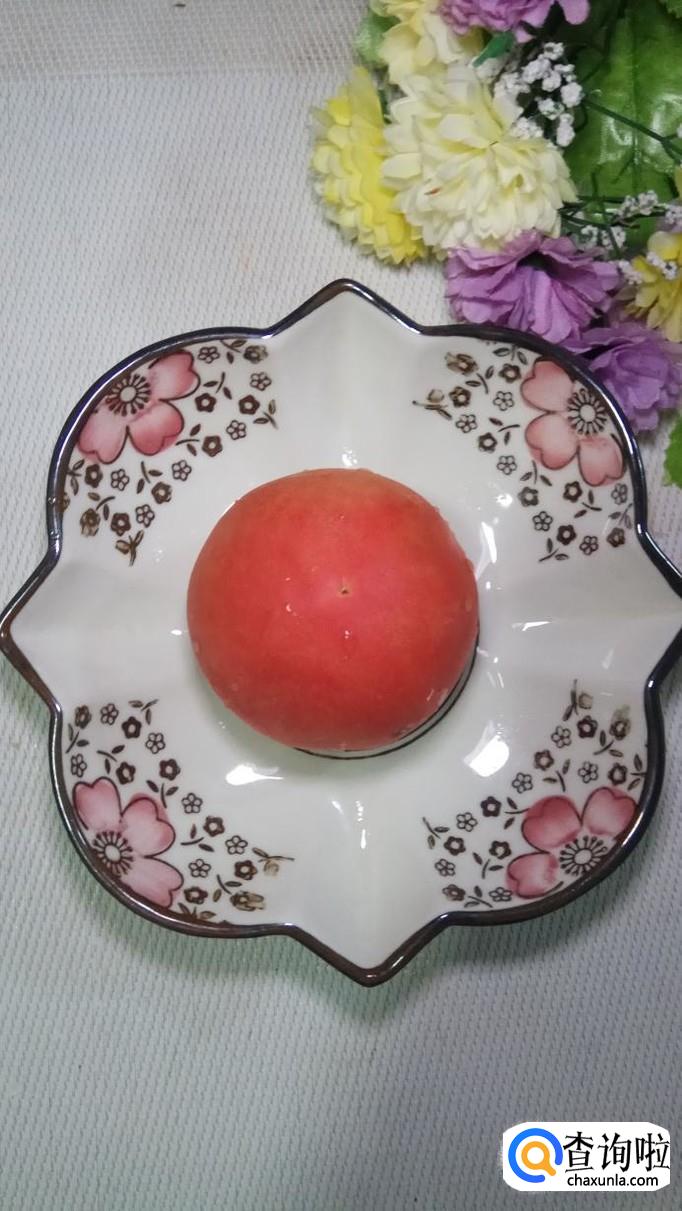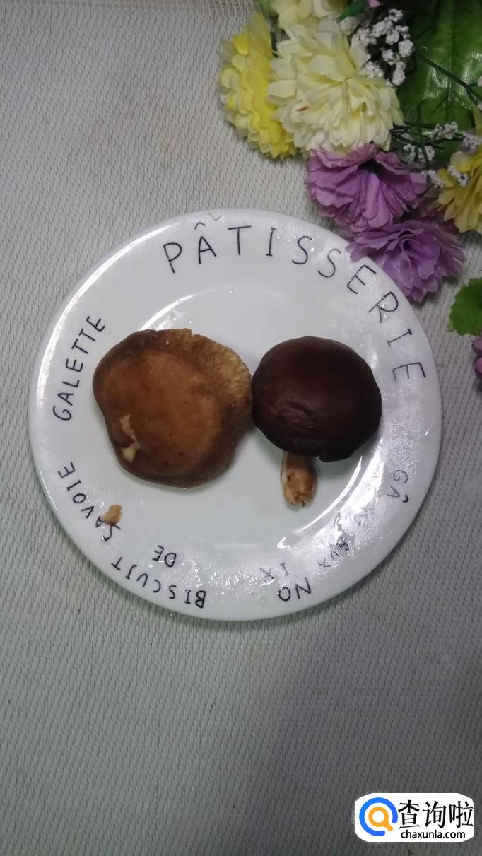准备食材:一个西红柿,两个鲜香菇,一小块五花肉,分别洗净后放入盘中备用。